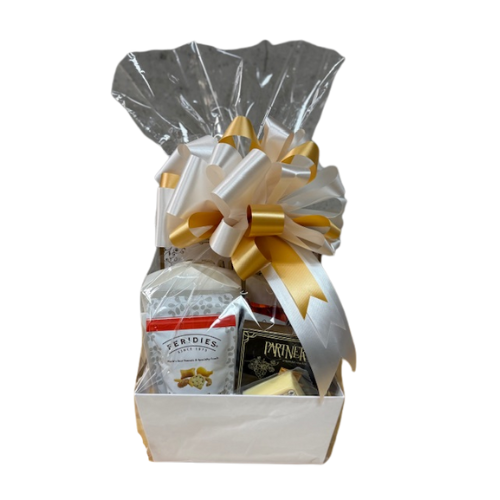 Discover pure delight with the Ivory Indulgence Gift Basket, a white market tray brimming with gourmet treasures. This features savory snack mix, premium cheese, crispy crackers, and irresistible cheese straws alongside rich chocolate chip cookies and more. Perfect for sharing with loved ones or treating yourself, each item has been selected to create a delicious blend of flavors and textures. Whether you're celebrating a special occasion or simply spreading joy, this elegant basket delivers sophistication and satisfaction in every bite.